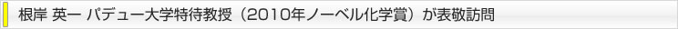 平成22年11月5日(金)午後、ノーベル化学賞の受賞が決まったパデュー大学(米国インディアナ州)の根岸英一 特待教授が来訪されました。 歴史を振り返れば、「研究が盛ん」=「産業が盛ん」であるという等式が成り立つのではないかと思う。つまり、研究が盛んな国ほど繁栄しており、その相関関係は決して無視できないと思う。これが真であるならば、我々は研究せざるを得ない。研究することは、将来的に経済的な発展に繋がるもの。結局、繁栄した国々はこうして繁栄してきた。