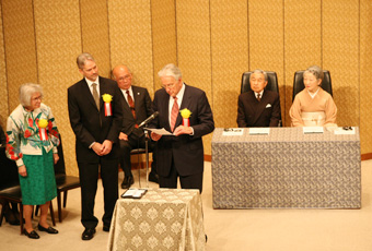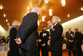 | 記念パーティにて受賞者と歓談される天皇陛下 |