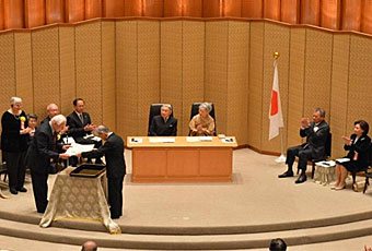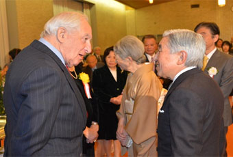| 記念パーティにて受賞者と歓談される天皇皇后両陛下 |