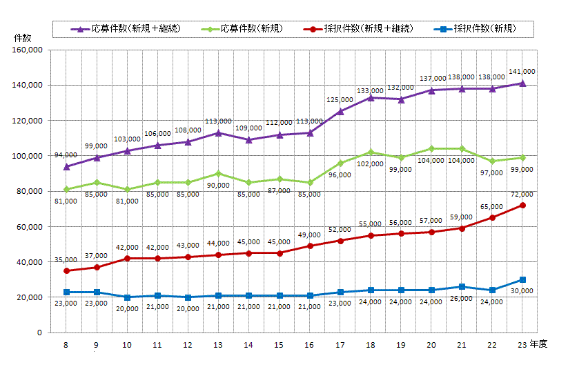 | 採択率(%) | 28.3 | 27.1 | 24.8 | 24.3 | 23.9 | 23.1 | 24.6 | 23.7 | 24.8 | 24.0 | 23.5 | 24.3 | 22.7 | 24.9 | 24.7 | 30.4 |