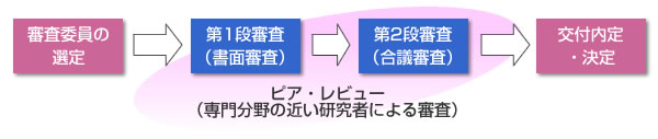配分審査は、第1段審査(研究計画1件あたり4人または6人の審査委員が個別に専門的見地から書面審査)、第2段審査(第1段審査の評価を基に総合的な調整を行うことを主眼とした、十数人から三十人程度で構成される専門分野ごとの各小委員会での合議審査)の二段審査で行います。