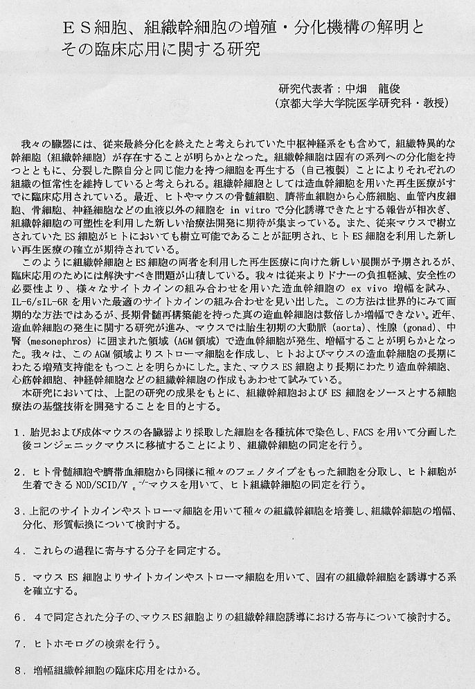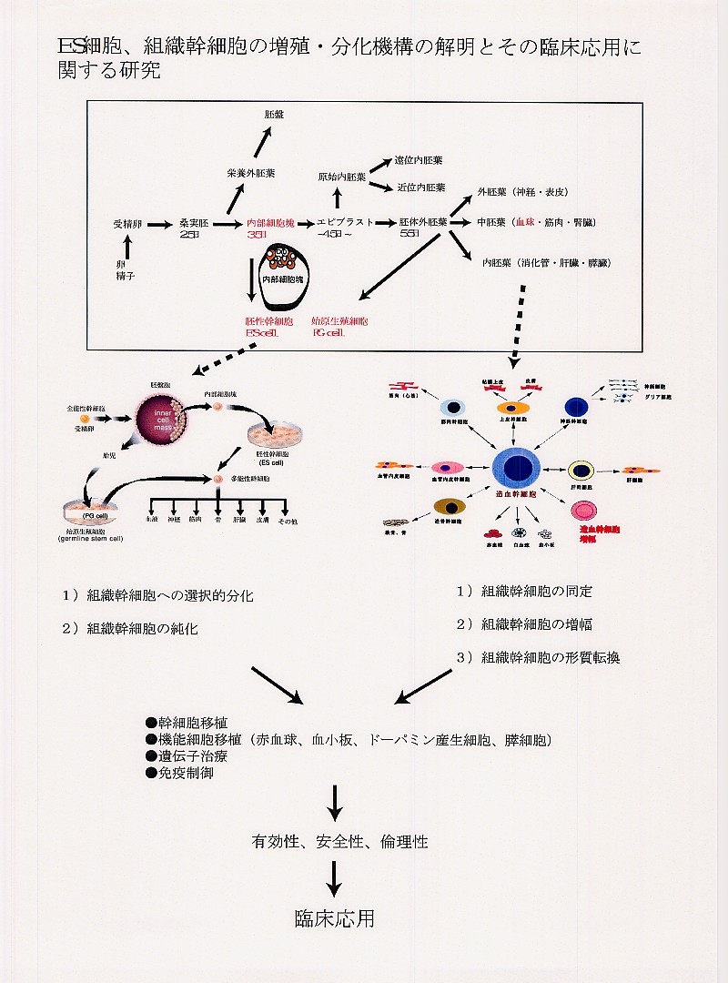 | ES細胞、組織幹細胞の増殖・分化機構の解明とその臨床応用に関する研究 |