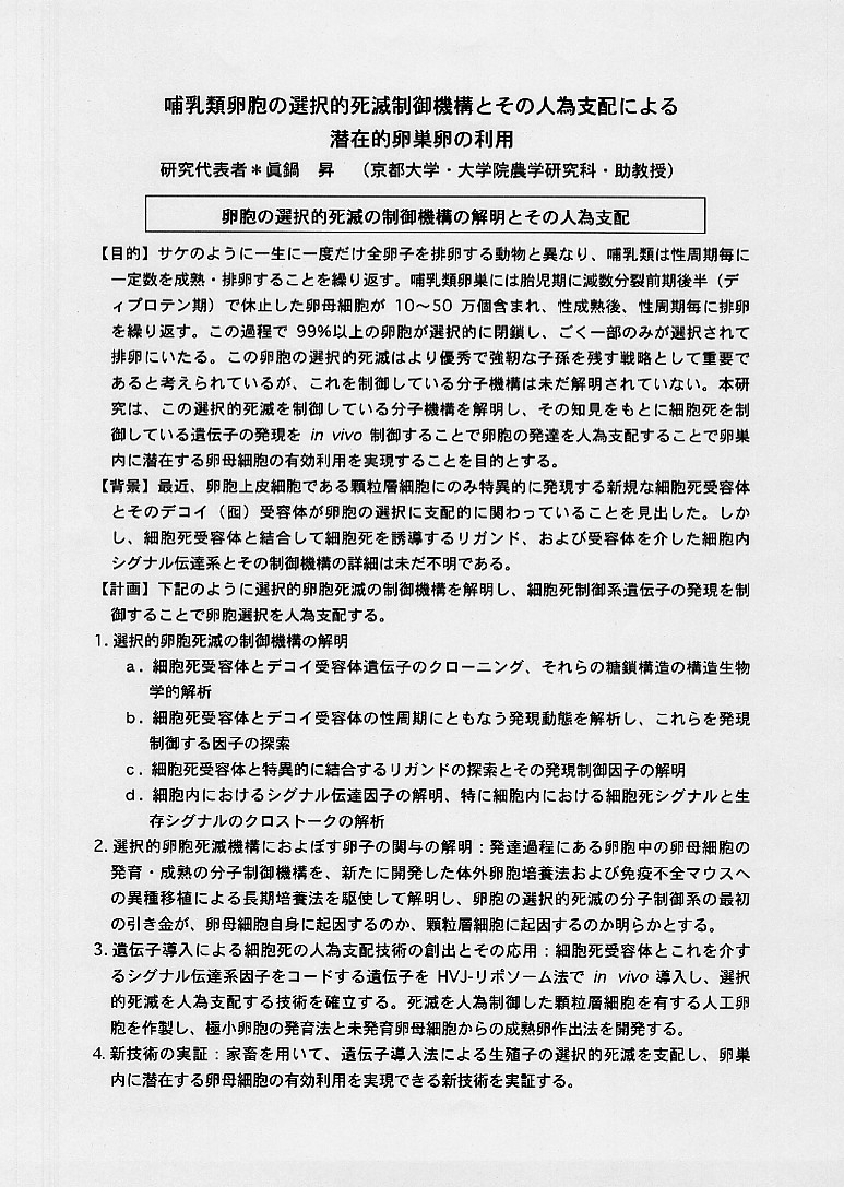 | 哺乳類卵胞の選択的死滅制御機構とその人為支配による潜在的卵巣卵の利用 |