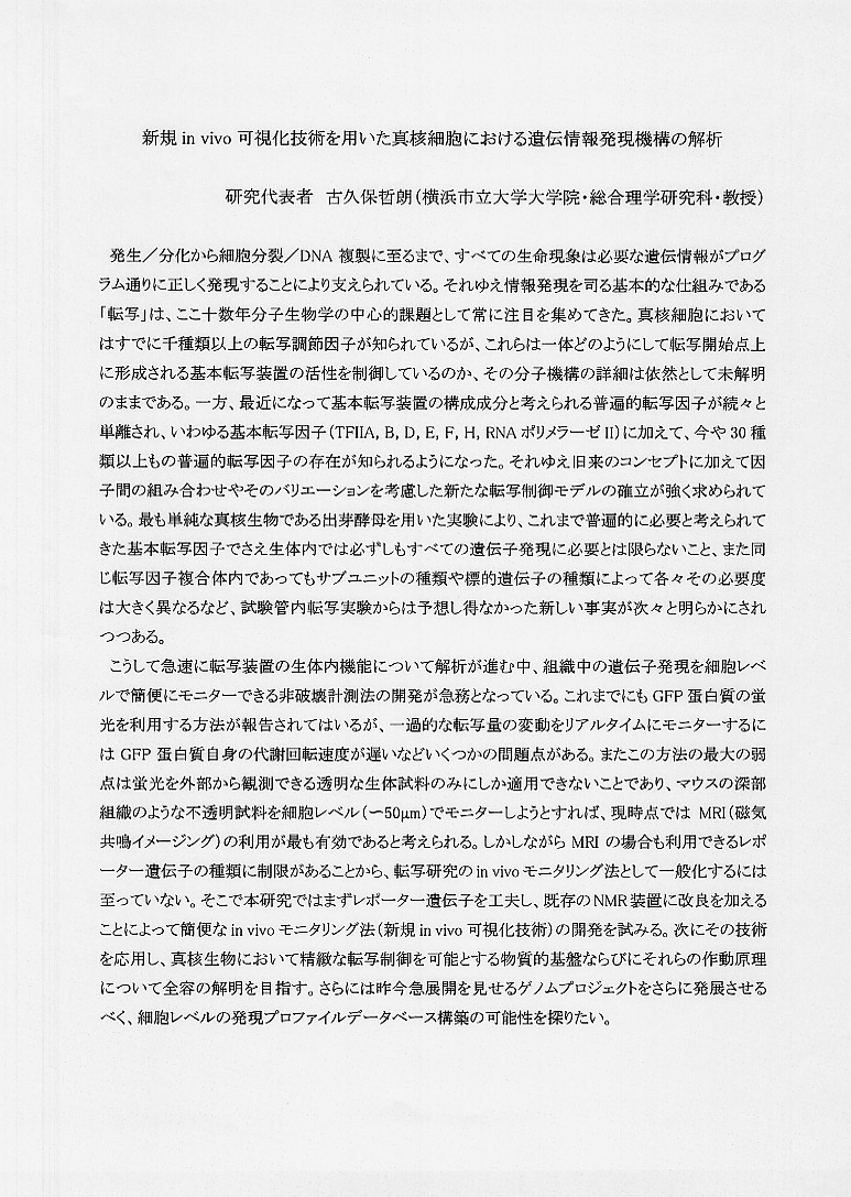 | 新規in vivo可視化技術を用いた真核細胞における遺伝情報発現機構の解析 |