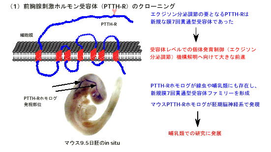 (1)前胸腺のエクジソン合成・分泌調節において中心的な役割を果たしている前胸腺刺激ホルモン(PTTH)の受容体候補遺伝子を発現クローニング法により単離に成功しました。この遺伝子には新規なG-蛋白質共役型膜7回貫通型受容体と思われる蛋白質(PTTH-R)がコードされていました。また、このPTTH-Rと相同性をもつタンパク質をコードする遺伝子が線虫や哺乳類にも存在し、マウスでは胚期の脳神経系で強い発現が見られました。今後、哺乳類での研究へ発展することが期待されます。
