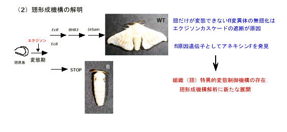 (2)エクジステロイドの翅形成に及ぼす影響を様々な側面から検討し、カイコの無翅(fl)変異体の翅形成では、エクジステロイドシグナルが翅でのみ正常に受容できず、その原因の一つはBHR3(ホルモン受容体3)遺伝子の活性低下によることを見いだしました。また、同定したfl遺伝子自体はカルシウム結合部とりん脂質結合部をもつ全く新規の遺伝子(アネキシン)と思われ、昆虫のみならずすべての動物の発生に根本的に関わる重要遺伝子と考えられます。