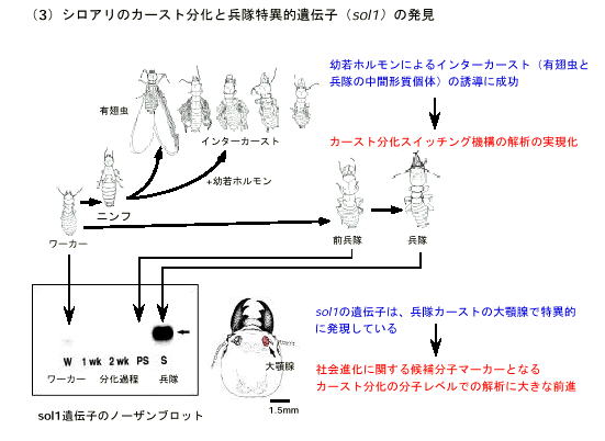 (3)ネバダオオシロアリのニンフにJHA処理を行うことにより、有翅型の兵隊(インターカースト)を作成することに成功しました。その際、ニンフの発育ステージが進むにつれて、兵隊形質の発現程度が低下すること、また兵隊形質の一つ大顎の大型化と有翅虫の形質である翅・複眼形成はトレードオフの関係にあり、両者の形質が有翅型兵隊で逆相関的に発現していることを明らかにしました。また、成熟したオオシロアリの兵隊で特異的に発現している数種類の新規遺伝子をDifferential Display 法により同定し、そのうち1つ(sol1)はノーザン解析でも兵隊で非常に強く発現されていることを確認しました。さらに、ペプチド抗体を作成し、雌雄やコロニーに関わらず兵隊のみでSOL1が発現・翻訳されていることを確認しました。