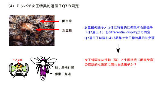 (4)女王蜂の脳と卵巣に選択的に発現するQ7遺伝子を同定し、その解析を進めました。この遺伝子産物は、女王蜂固有な行動(脳)と生理状態(卵巣発育)の協調的な調節に関わる可能性が考えられます。 今後は研究対象をシロアリに絞り、カースト選択的に発現する遺伝子の同定を継続するとともに、カースト分化制御因子の同定を試みる予定です。特に、兵隊アリと有翅(生殖)虫のカースト分化に注目し、個体の生理的(ホルモン)環境、個体間相互作用によるカースト分化のスイッチング機構を探求します。また、社会行動を司る遺伝子(特に兵隊の攻撃行動に着目)の同定を新たに目指します。これらの研究を通じて、各個体がカースト特異的な発育様式を獲得したという観点から昆虫の社会性構築のメカニズムを探りたいと考えています。