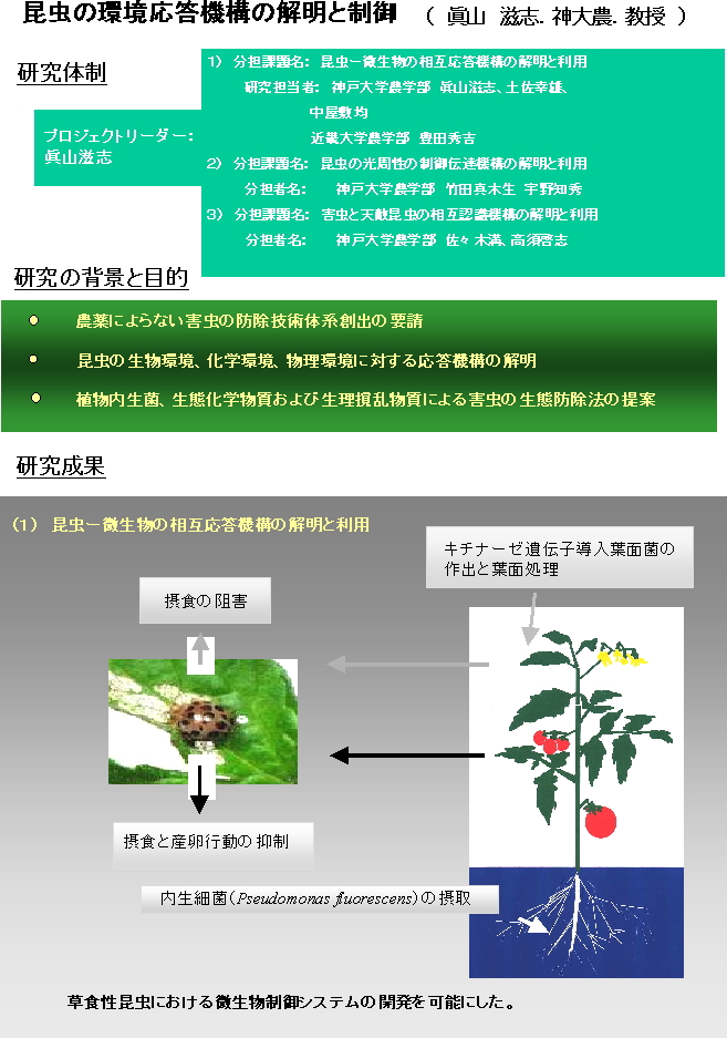 草食性昆虫の摂食行動メカニズムを解明するためには、昆虫とその摂食植物との生理生態的関係を解析するとともに、摂食植物に生存する細菌や昆虫体内の共生細菌との競合関係を明らかにし、このような植物を摂食した場合に昆虫がどのような影響を受けるかを明らかにする必要があります。過去2年半、草食性昆虫を取りまくこれら微生態環境を解析した結果、昆虫が摂食する植物には葉上(エピファイト)および内生細菌(エンドファイト)が生存し、これらが昆虫の摂食行動と成長に影響すること、エンドファイトが植物に内生した場合には、植物葉を介して昆虫の摂食行動を抑制することを明らかにしました。加えて、これら微生物の外来遺伝子導入系も確立しました。以上のことから、個々の相互関係を改善・強化することが可能となり、微生物を介した新規の昆虫制御系の開発が行えるようになりました。一方、昆虫の行動や成長を制御する物質の検索も試みられ、昆虫誘因忌避物質や疑似餌の利用と開発が進められました。また、昆虫の光周時計にかかわる制御遺伝子やその発現物質についても解析され、その詳細を明らかすることができました。