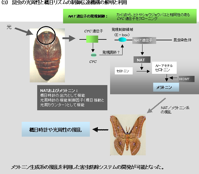 6)メラトニン合成系が概日時計の出力として機能し、光周時計の制御因子であることが 判明しましたので、メラトニン合成酵素NATとHIOMT遺伝子のクローニングおよび メラトニン受容体の解析を行い、昆虫における光周性と概日リズムの制御伝達機構を解明します。