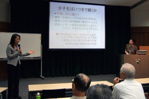 ![]() 7月6日(金) 14:00〜16:00に麗澤大学生涯教育プラザ・プラザホールにおいて、柏市周辺の市民、麗澤大学の教職員、麗澤大学と慶應義塾大学の大学院生を含む47名の参加者を迎え、上記のテーマでサイエンスカフェ・人社版を開催した。近年、歯止めのかからない少子化を切り口に、日本人男女の結婚、子育てと家庭、働き方の変化について、まず研究者による実証分析結果に基づいたわかりやすいプレゼンテーションを行い、引き続き、インフォーマルな雰囲気の中で、参加者たちとの話し合いの機会をもった。参加者からよせられた多くの質問をベースに、少子化の最大の要因である未婚化、家庭内の家事・育児分担、そしてワーク・ライフ・バランスを含め、欧米先進諸国や他のアジア諸国との比較にまで言及した充実したディスカッションが行われた。これから家族形成にむかう大学院生、子育て中の母親、そして子や孫をもつ中高年世代の参加者たち、そして研究グループのメンバーにとっても、それぞれの立場から、今後の家族のありかたや働き方を考える有益な機会となった。