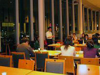当日は、日本科学未来館 7F にあるレストラン basara をお借りし、日本科学未来館の科学コミュニケーターの司会進行のもと、17:45-18:45 の約1時間にわたって人社カフェを実施した (実際には、カフェ終了後も、19:15 まで質問・会話が続いた)。