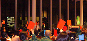 まず、最初の 15 分程度、なぜ動物実験の規制について考えるようになったのかという私の経験について話をした(上の写真)。そして、残りの時間は全て質疑やディスカッションに費やした。また、ディスカッションを促すために、動物実験の経験の有無等について、参加者に質問をし、赤と青のパネルで答えてもらった(左の写真)。